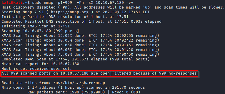 Perform an Xmas scan on the first 999 ports of the target – how many ports are shown to be open or filtered?