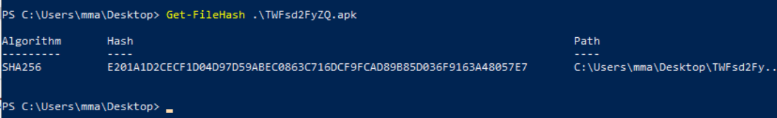 We need to get the has with “Get-FileHash” or from within MobSF